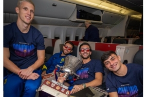 巴萨全队已经返回巴塞罗那,俱乐部官方社媒晒出球员们在飞机内与奖杯的合照,配文:“享受飞行旅途。”