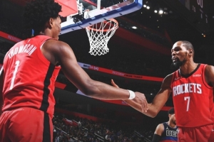 赛后火箭官推发布赢球海报,封面为杜兰特和阿门击掌瞬间。