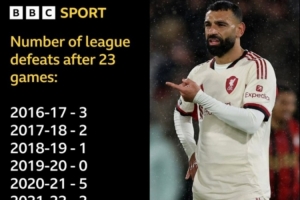 利物浦本赛季前23轮联赛输7场,近10个赛季同期并列最多