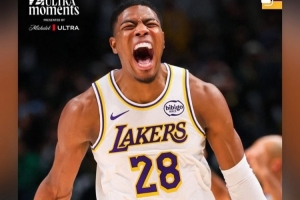 连进两记关键三分!詹姆斯转发八村塁庆祝照:大心脏黑武士