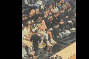 湾区媒体95.7 The Game晒出库里在场边的画面,当时库里沮丧地拍了拍大腿,随后一瘸一拐走回更衣室。