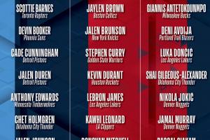 星条队:杰伦·布朗、布伦森、库里、杜兰特、詹姆斯、伦纳德、米切尔、鲍威尔